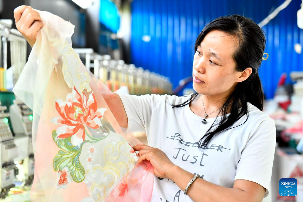 A staff member checks the quality of traditional Chinese Hanfu clothing at a Hanfu base in Caoxian County, east China's Shandong Province, July 6, 2023. Caoxian County has developed a complete Hanfu industrial chain in recent years. At present, there are more than 2,100 Hanfu-related enterprises in the county. The sales of Hanfu in Caoxian reached nearly 4 billion yuan (about 552 million U.S. dollars) in the first half of this year. (Xinhua/Guo Xulei)