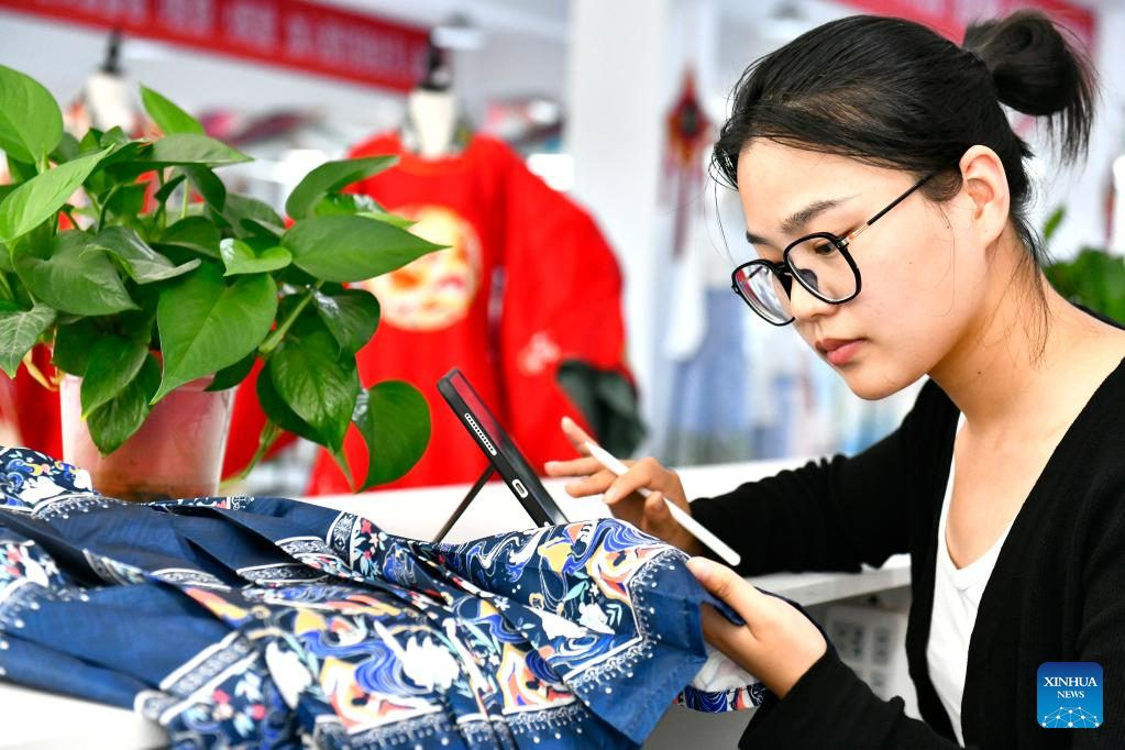 Designer Liang Li works on an embroidery pattern of traditional Chinese Hanfu clothing at a Hanfu base in Caoxian County, east China's Shandong Province, July 6, 2023. Caoxian County has developed a complete Hanfu industrial chain in recent years. At present, there are more than 2,100 Hanfu-related enterprises in the county. The sales of Hanfu in Caoxian reached nearly 4 billion yuan (about 552 million U.S. dollars) in the first half of this year. (Xinhua/Guo Xulei)