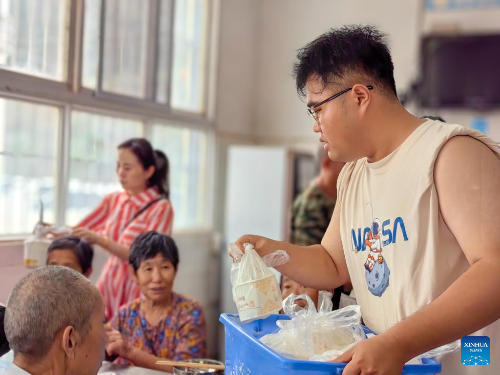 A volunteer distributes food at a temporary settlement in Changtan junior school of Wanzhou District, Chongqing Municipality, southwest China, July 6, 2023. (Xinhua/Wang Jintao)