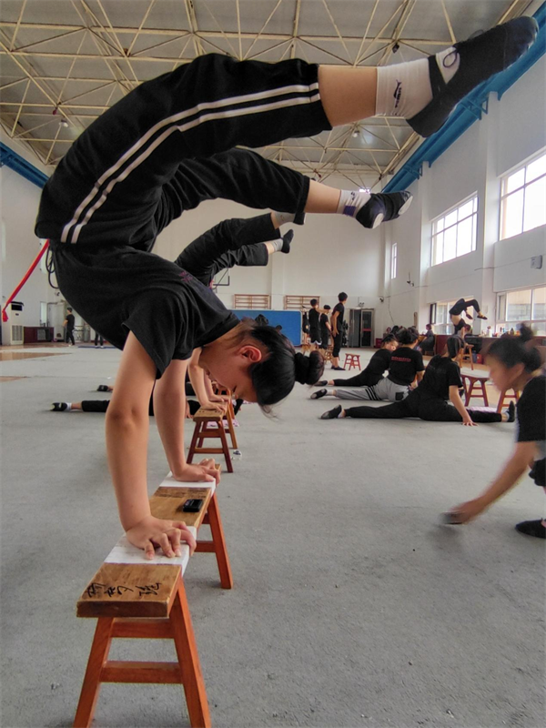 Acrobats perform routine exercises in Wuqiao county, Cangzhou, north China's Hebei Province. (People's Daily Online/Zhao Zhao)
