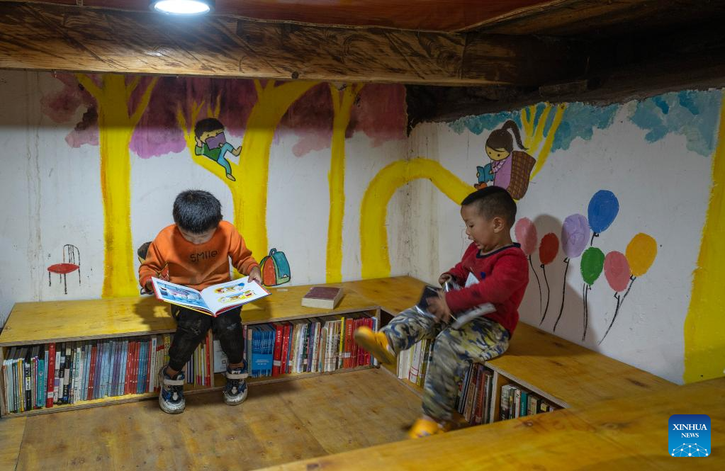 Children read books at the "Banshan Huayu" library in Qiunatong Village of Bingzhongluo Township in Gongshan Dulong and Nu Autonomous County, Lisu Autonomous Prefecture of Nujiang, southwest China's Yunnan Province, July 5, 2023. (Xinhua/Jiang Wenyao)