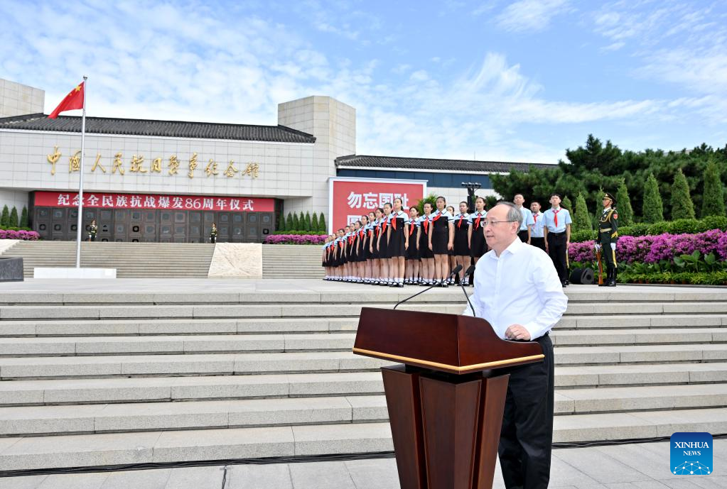 Yin Li, a member of the Political Bureau of the Communist Party of China (CPC) Central Committee and secretary of the CPC Beijing Municipal Committee, presided over the ceremony at the Museum of the War of the Chinese People's Resistance Against Japanese Aggression near the Lugou Bridge, where the historic Lugou Bridge Incident took place 86 years ago on July 7, 1937.