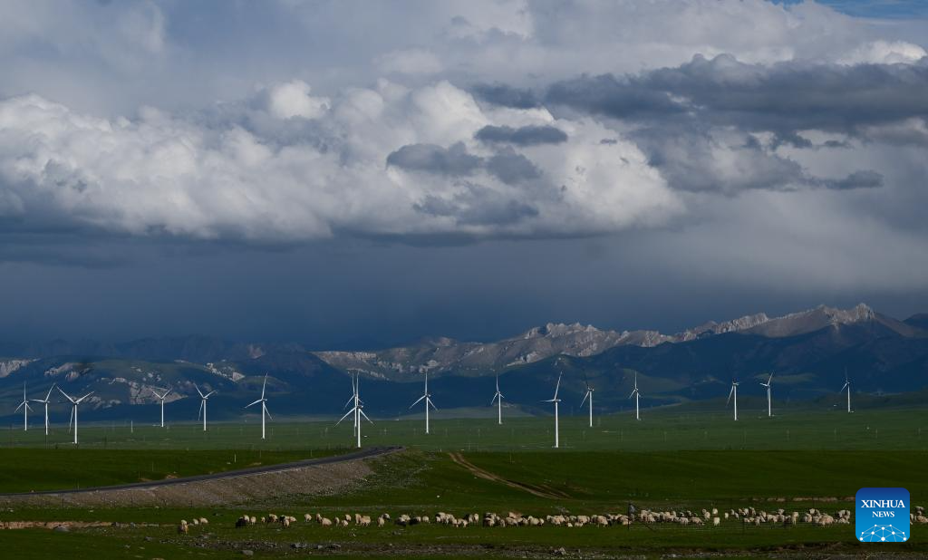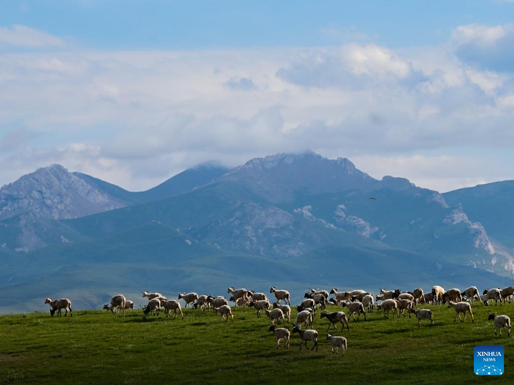 This photo taken on July 6, 2023 shows a flock of sheep on the grassland in Tianjun County of Haixi Mongolian and Tibetan Autonomous Prefecture, northwest China's Qinghai Province. The grassland in Tianjun County, located at the southern foot of Qilian Mountains, is over 50 kilometers to the east of Qinghai Lake. (Xinhua/Zhang Long)