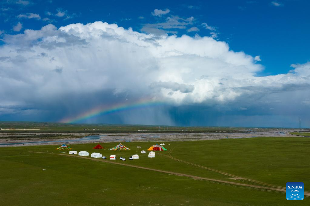 This aerial photo taken on July 6, 2023 shows a camping site on the grassland in Tianjun County of Haixi Mongolian and Tibetan Autonomous Prefecture, northwest China's Qinghai Province. The grassland in Tianjun County, located at the southern foot of Qilian Mountains, is over 50 kilometers to the east of Qinghai Lake. (Xinhua/Zhang Long)