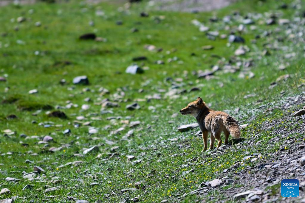 This photo taken on July 6, 2023 shows a fox on the grassland in Tianjun County of Haixi Mongolian and Tibetan Autonomous Prefecture, northwest China's Qinghai Province. The grassland in Tianjun County, located at the southern foot of Qilian Mountains, is over 50 kilometers to the east of Qinghai Lake. (Xinhua/Zhou Shengsheng)