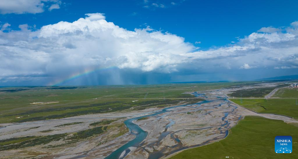 This aerial photo taken on July 6, 2023 shows a view of the grassland in Tianjun County of Haixi Mongolian and Tibetan Autonomous Prefecture, northwest China's Qinghai Province. The grassland in Tianjun County, located at the southern foot of Qilian Mountains, is over 50 kilometers to the east of Qinghai Lake. (Xinhua/Li Zhanyi)