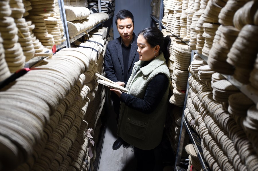 Guo Juan and her husband Niu Junjun check the quality of soles at the factory in Gangu County, northwest China's Gansu Province, Jan. 10, 2020. (Xinhua/Fan Peishen)