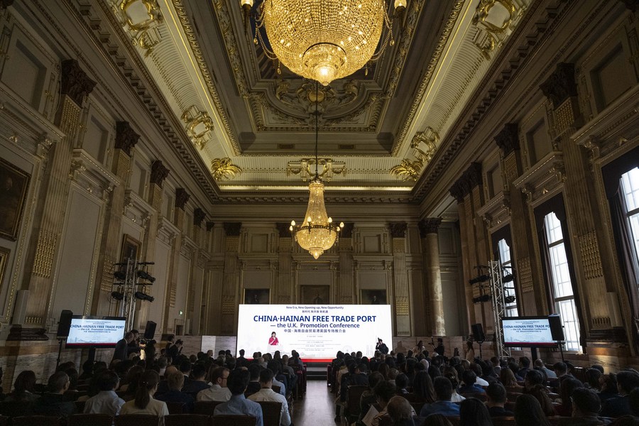 This photo taken on June 9, 2023 show a view of China Hainan Free Trade Port -- the U.K. Promotion Conference in London, Britain. (Photo by Stephen Chung/Xinhua)