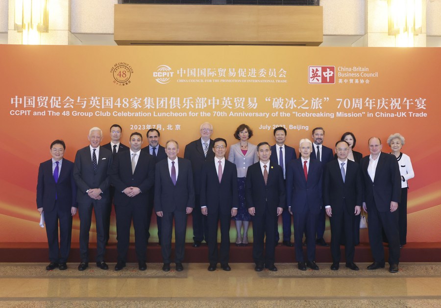 Chinese Vice President Han Zheng poses for a group photo with some guests while attending an event commemorating the 70th anniversary of the "Icebreaking Mission" in China-UK trade in Beijing, capital of China, July 6, 2023. (Xinhua/Liu Weibing)
