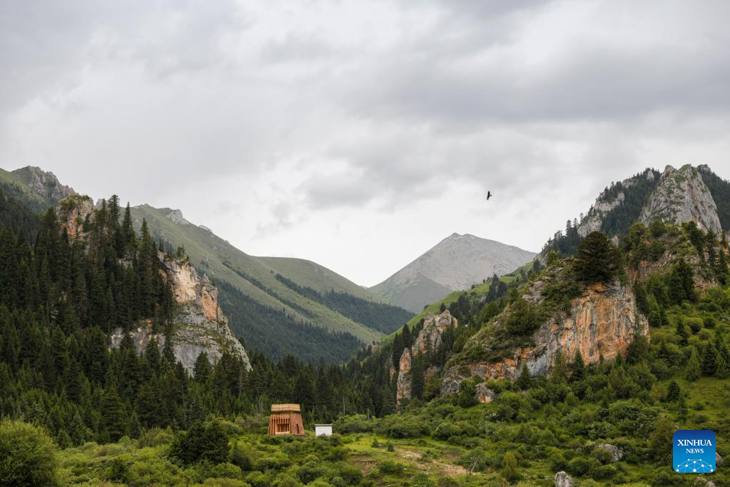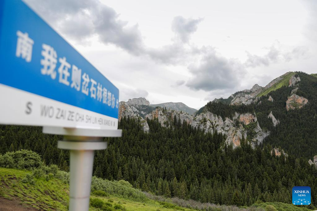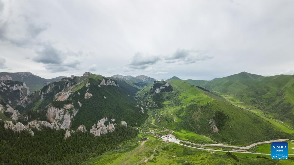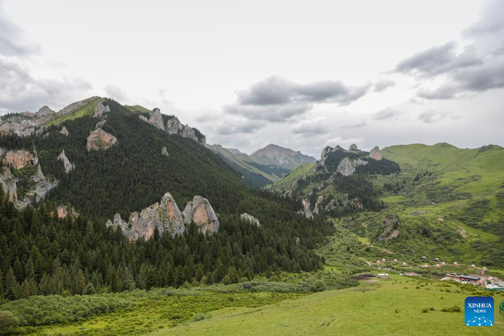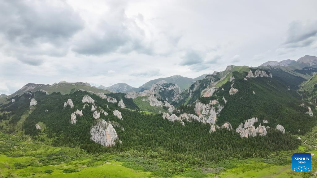 This photo taken on July 8, 2023 shows a view of Zecha stone forest scenic spot in Luqu County of the Tibetan Autonomous Prefecture of Gannan, northwest China's Gansu Province. The Zecha stone forest scenic spot boasts grotesque stones and abundant wild lives. In 1998, Zecha stone forest scenic spot and Gahai Lake were listed as Gahai-Zecha National Nature Reserve. (Xinhua/Chen Bin)