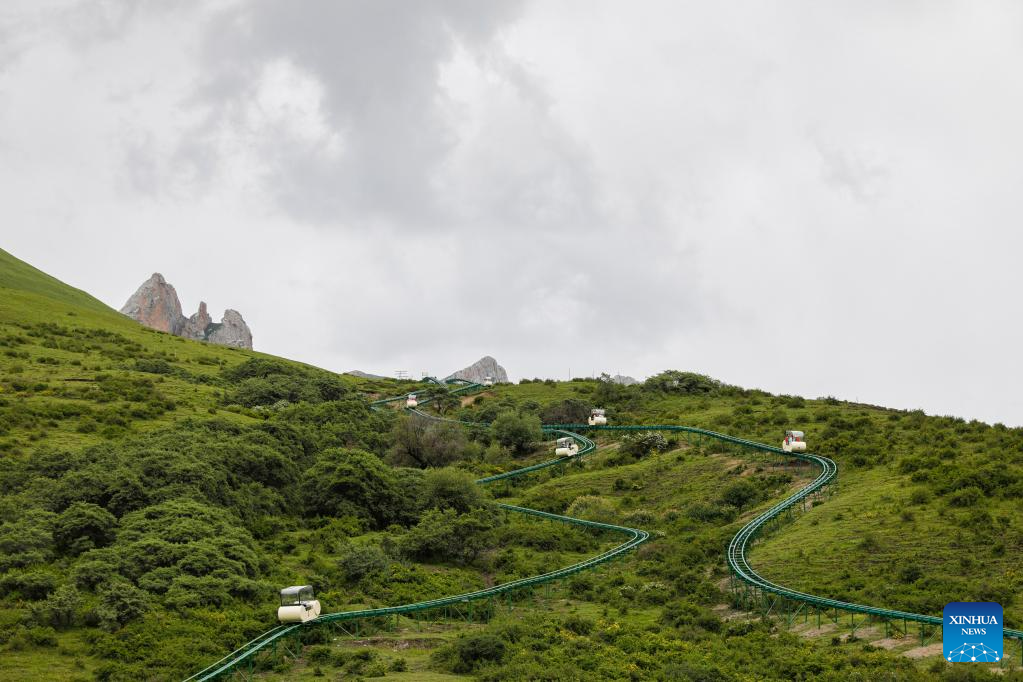 Tourists take sightseeing railcars at Zecha stone forest scenic spot in Luqu County of the Tibetan Autonomous Prefecture of Gannan, northwest China's Gansu Province, July 8, 2023. The Zecha stone forest scenic spot boasts grotesque stones and abundant wild lives. In 1998, Zecha stone forest scenic spot and Gahai Lake were listed as Gahai-Zecha National Nature Reserve. (Xinhua/Fang Xin)