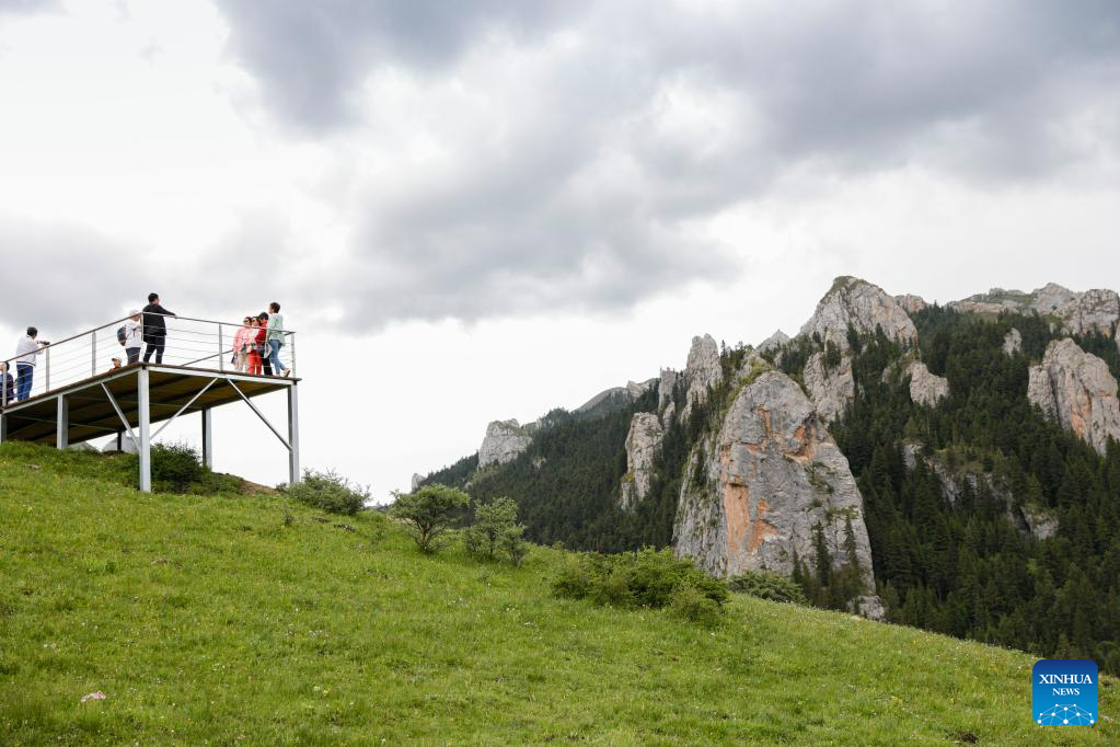 Tourists take photos at Zecha stone forest scenic spot in Luqu County of the Tibetan Autonomous Prefecture of Gannan, northwest China's Gansu Province, July 8, 2023. The Zecha stone forest scenic spot boasts grotesque stones and abundant wild lives. In 1998, Zecha stone forest scenic spot and Gahai Lake were listed as Gahai-Zecha National Nature Reserve. (Xinhua/Fang Xin)