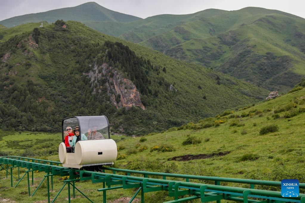 Tourists take a sightseeing railcar at Zecha stone forest scenic spot in Luqu County of the Tibetan Autonomous Prefecture of Gannan, northwest China's Gansu Province, July 8, 2023. The Zecha stone forest scenic spot boasts grotesque stones and abundant wild lives. In 1998, Zecha stone forest scenic spot and Gahai Lake were listed as Gahai-Zecha National Nature Reserve. (Xinhua/Zhang Keren)