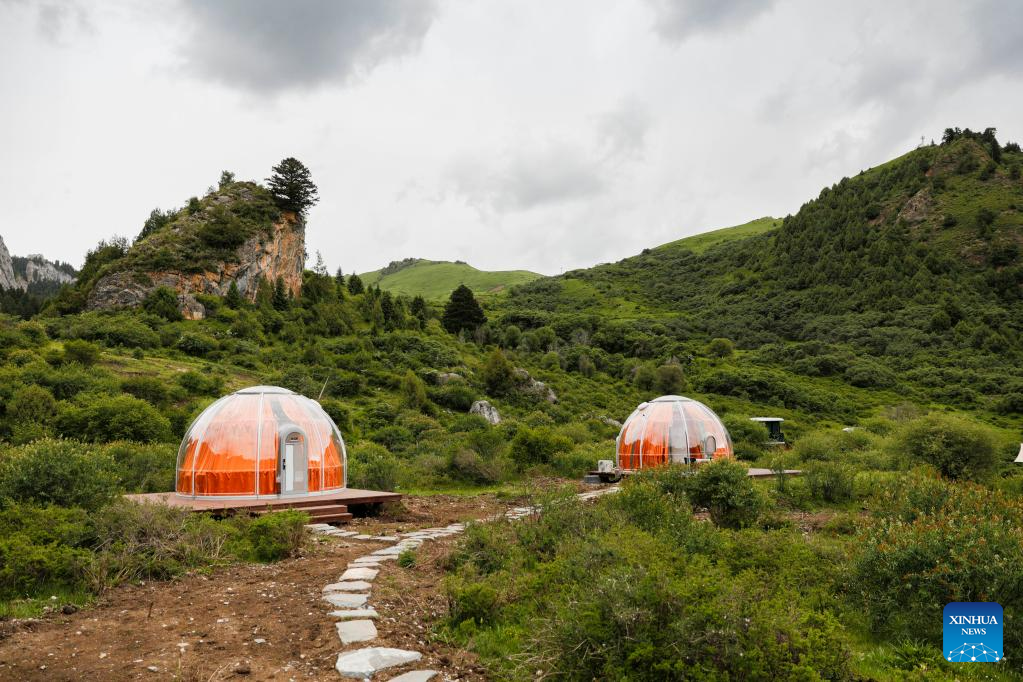 This photo taken on July 8, 2023 shows the tents at the Zecha stone forest scenic spot in Luqu County of the Tibetan Autonomous Prefecture of Gannan, northwest China's Gansu Province. The Zecha stone forest scenic spot boasts grotesque stones and abundant wild lives. In 1998, Zecha stone forest scenic spot and Gahai Lake were listed as Gahai-Zecha National Nature Reserve. (Xinhua/Chen Bin)