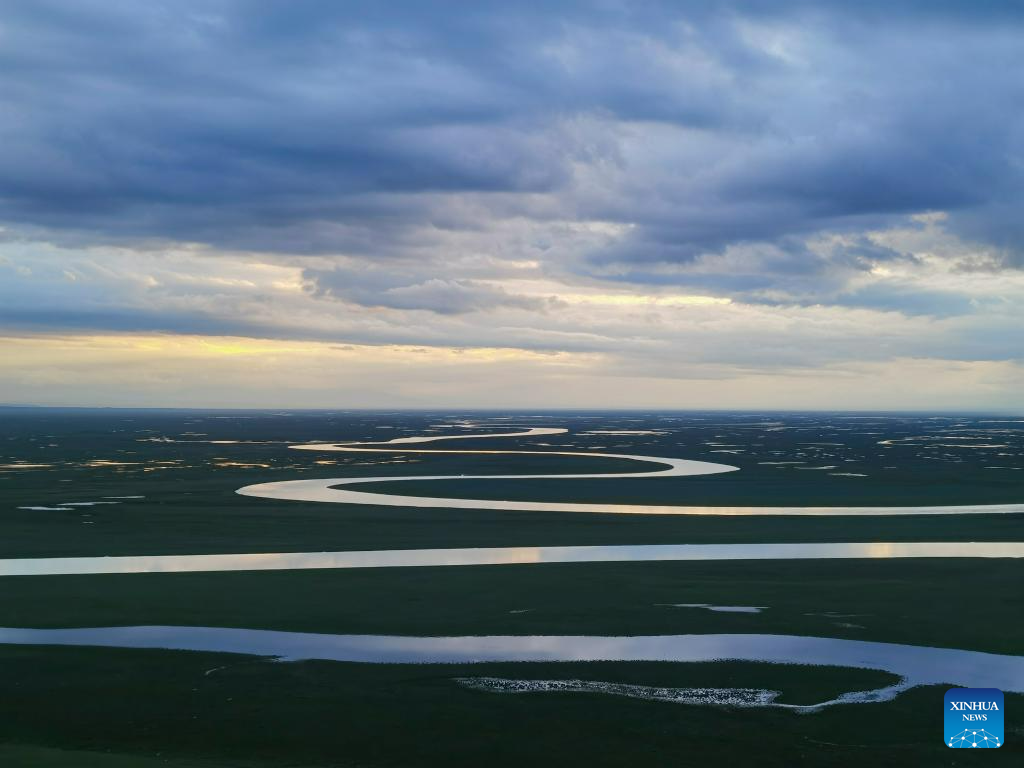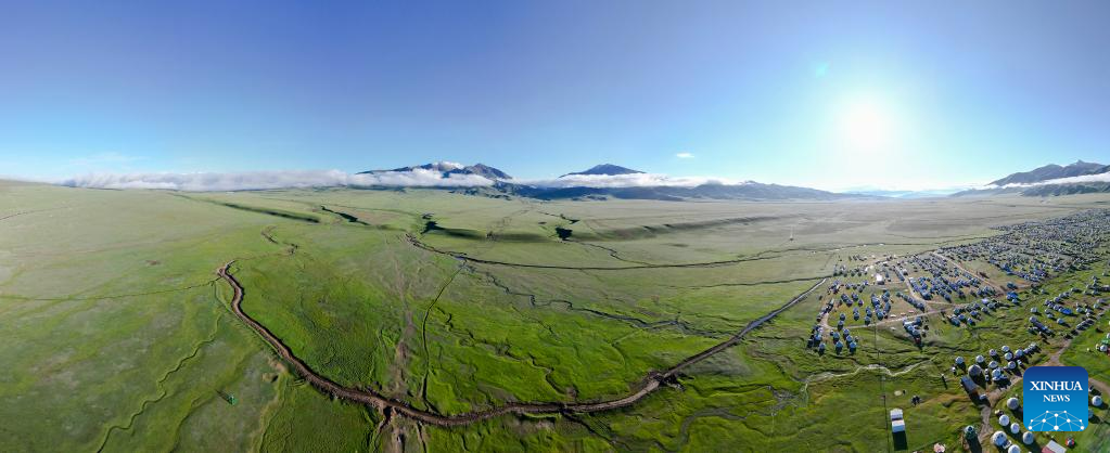This aerial panorama taken on July 7, 2023 shows a view of the Bayan Bulag grassland in Hejing County, Bayingolin Mongolian Autonomous Prefecture, northwest China's Xinjiang Uygur Autonomous Region. Midsummer is one of the best time of year to visit the Bayan Bulag grassland in Hejing County. (Xinhua/Hao Zhao)