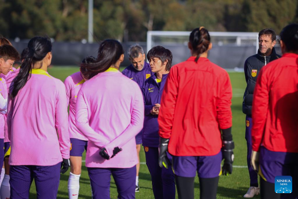 Shui Qingxia (C), head coach of Chinese women's national team, talks to the players during a training session in Adelaide, the capital city of South Australia, Australia, July 8, 2023. (Photo by Xie Sida/Xinhua)