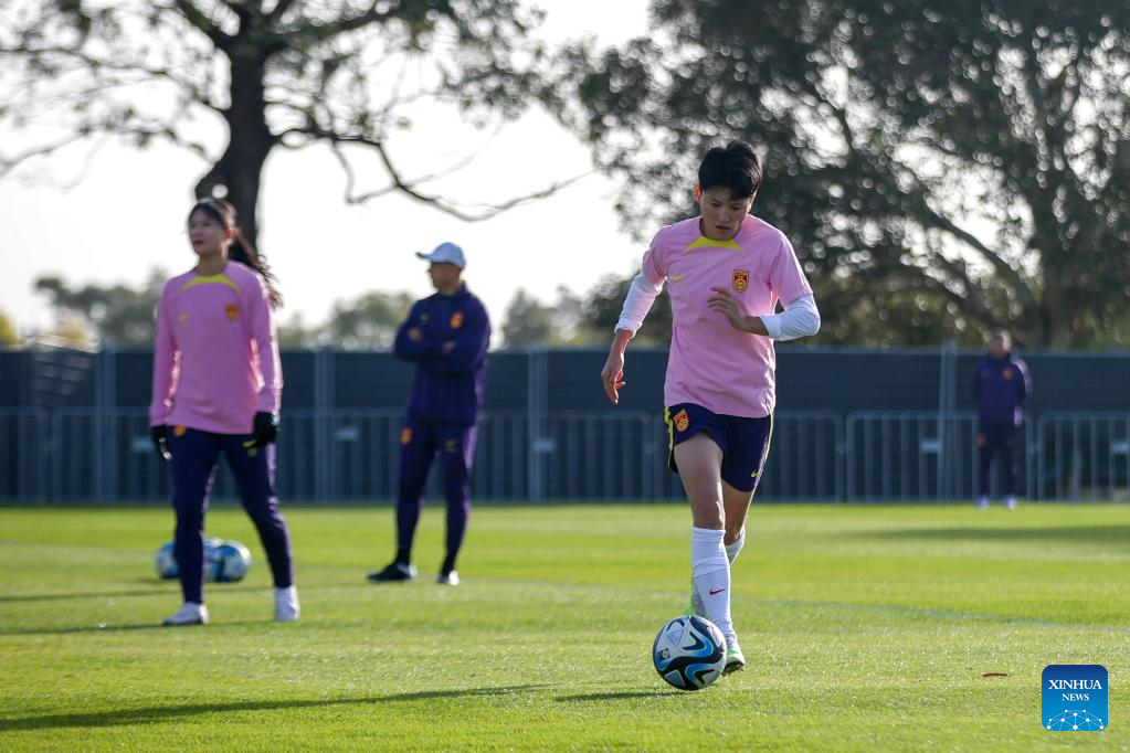 Wang Shanshan (R) of China participates in a training session in Adelaide, the capital city of South Australia, Australia, July 8, 2023. (Photo by Xie Sida/Xinhua)
