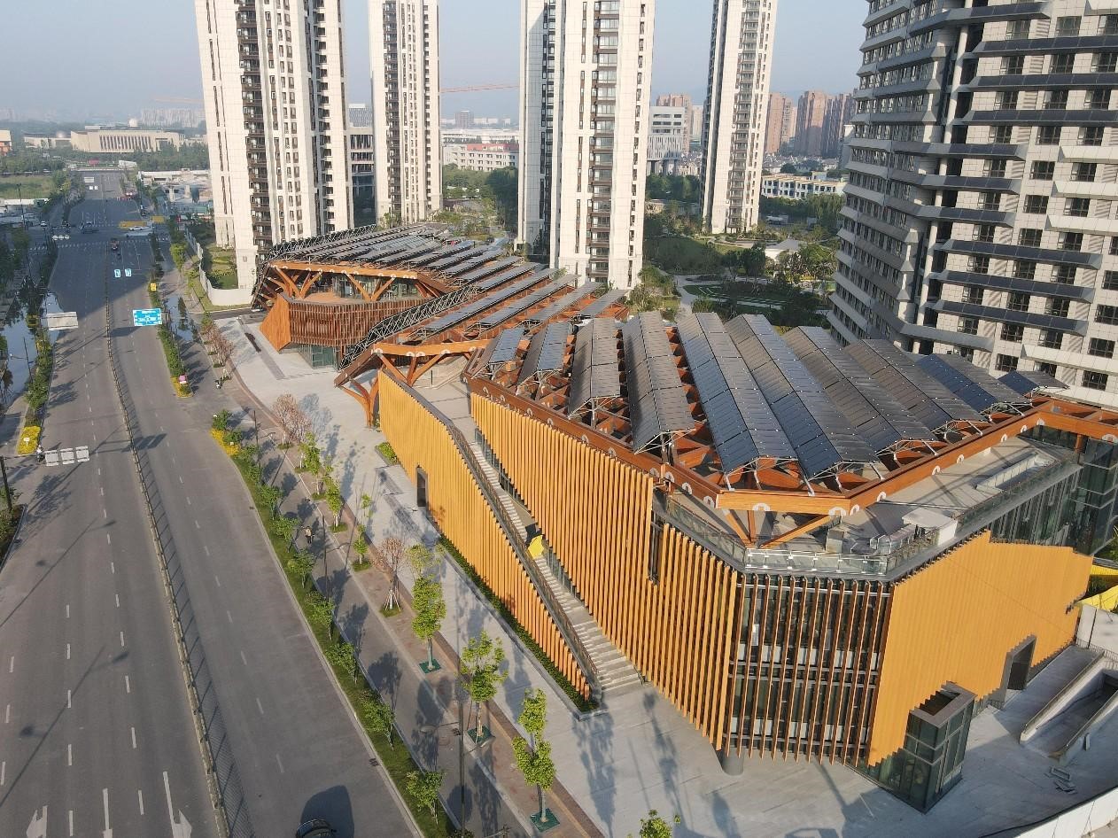 The "wooden house" is the service center of a residential complex for talents working in the city. The biggest highlight of the structure is that it is self-sufficient in energy.