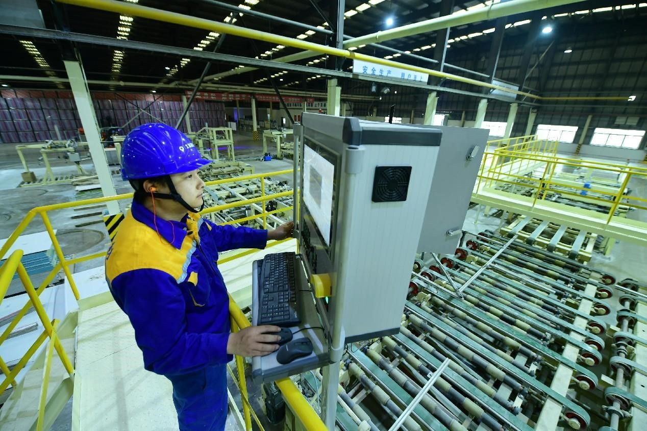 A technician checks the production of a full-automated production line in a factory of a construction materials company in Taicang, east China's Jiangsu province. (People's Daily Online/Ji Haixin)