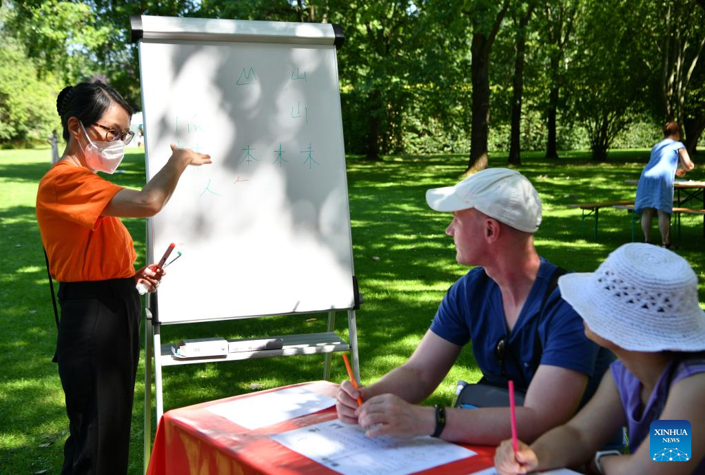 People learn Chinese during the cultural festival "Culture meets Garden" at the Gardens of the World in Berlin, Germany, on July 8, 2023. The festival was held here from Saturday to Sunday. (Xinhua/Ren Pengfei)