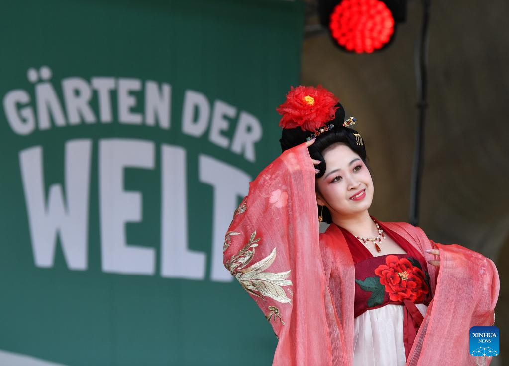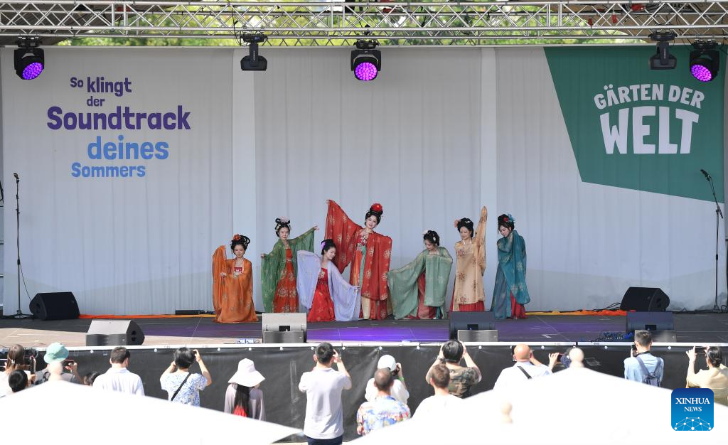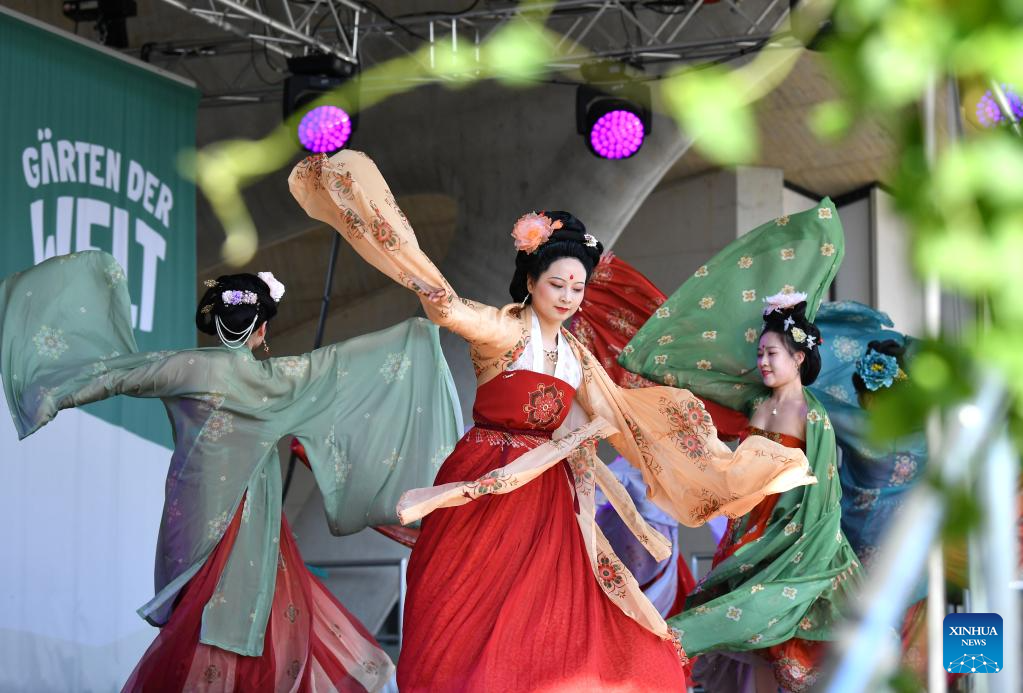 Enthusiasts present creations of Hanfu, a type of traditional Chinese garment, during the cultural festival "Culture meets Garden" at the Gardens of the World in Berlin, Germany, on July 8, 2023. The festival was held here from Saturday to Sunday. (Xinhua/Ren Pengfei)