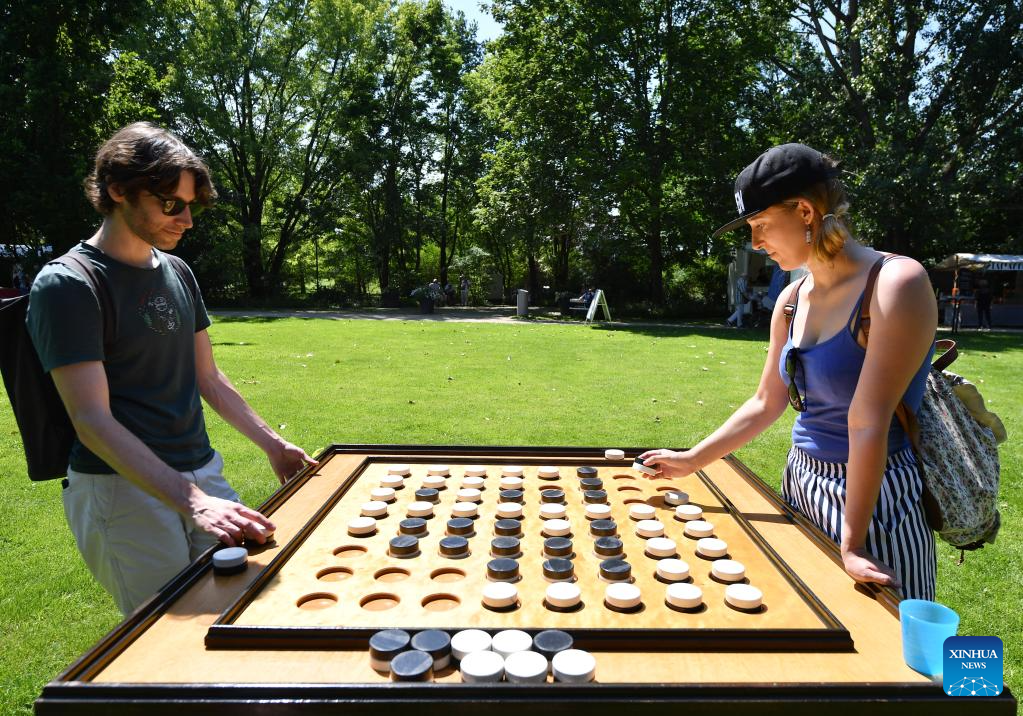 People play a board game during the cultural festival "Culture meets Garden" at the Gardens of the World in Berlin, Germany, on July 8, 2023. The festival was held here from Saturday to Sunday. (Xinhua/Ren Pengfei)