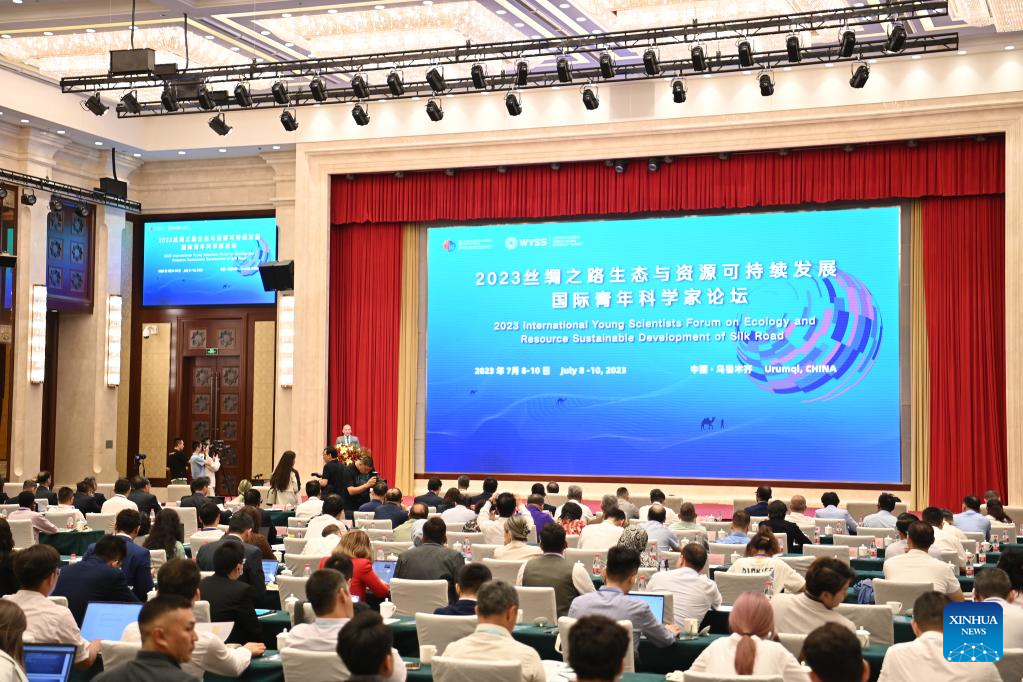 This photo taken on July 8, 2023 shows a scene of the 2023 International Young Scientists Forum on Ecology and Resource Sustainable Development of Silk Road in Urumqi, northwest China's Xinjiang Uygur Autonomous Region.(Xinhua/Li Xiang)