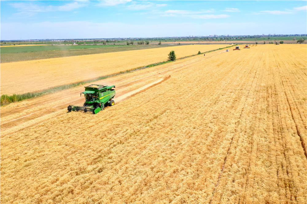 Harvesters reap wheat in Xiaotuguli village, Ershilidian township in Hutubi county, northwest China's Xinjiang Uygur Autonomous Region. (Photo/Tao Weiming)