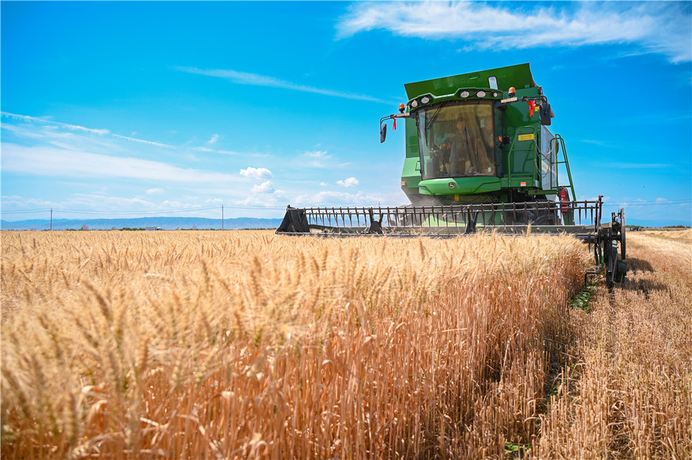 A harvester reaps wheat in Xiaotuguli village, Ershilidian township in Hutubi county, northwest China's Xinjiang Uygur Autonomous Region. (Photo/Tao Weiming)