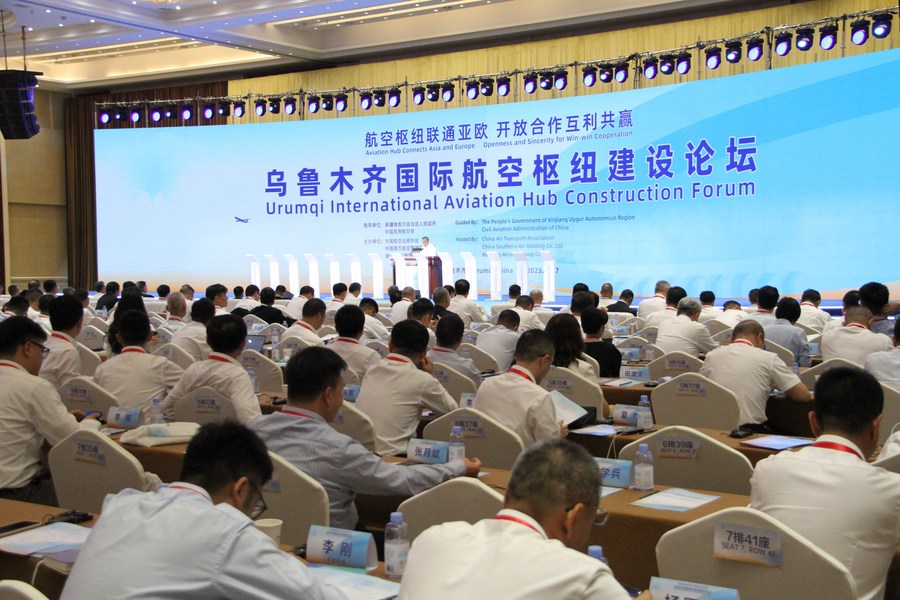 This photo taken on July 6, 2023 shows a scene of the Urumqi International Aviation Hub Construction Forum in Urumqi, northwest China's Xinjiang Uygur Autonomous Region. (Xinhua/Liu Hongxia)
