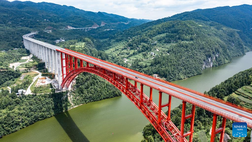 This aerial photo taken on July 10, 2023 shows a grand bridge of the Dejiang-Yuqing expressway in southwest China's Guizhou Province. The Dejiang-Yuqing expressway was completed and opened to traffic on Monday, which has a total length of 104.324 kilometers and connects five counties including Dejiang, Sinan, Fenggang, Shiqian and Yuqing of the cities of Tongren and Zunyi in Guizhou. (Xinhua/Tao Liang)