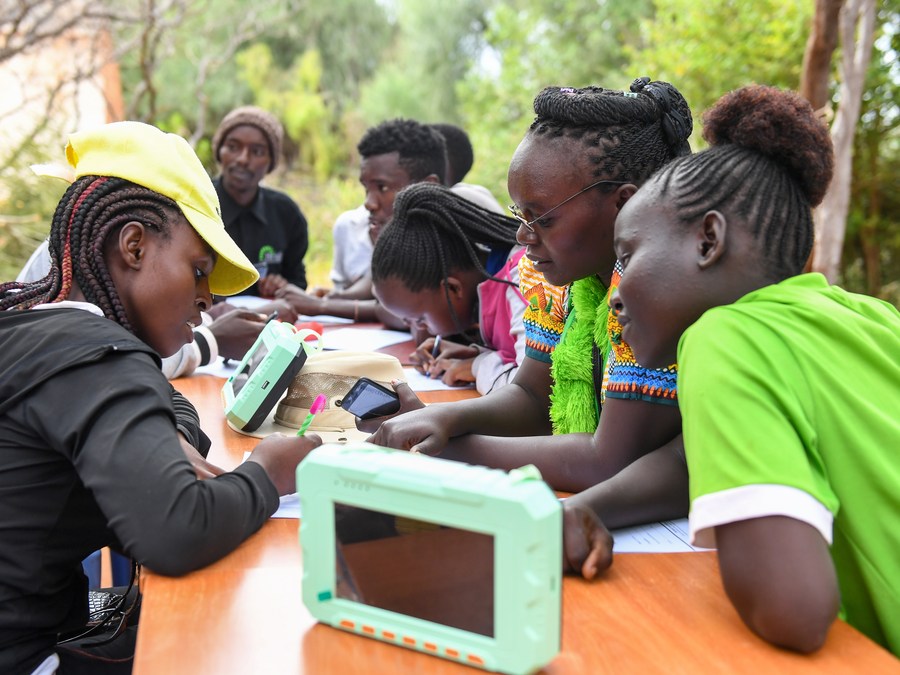 People register during a launching ceremony of a solar media project in Nthunguni village of Mtito Andei, Kenya on July 1, 2023. (Xinhua/Li Yahui)