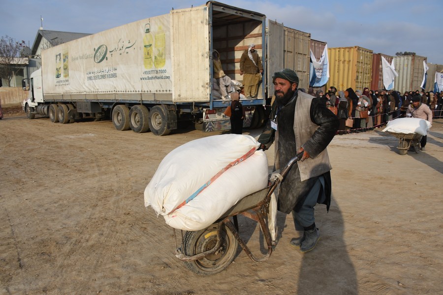 An Afghan teacher carries humanitarian assistance in Mazar-i-Sharif, capital of Balkh province, Afghanistan, Dec. 15, 2021. (Photo by Kawa Basharat/Xinhua)