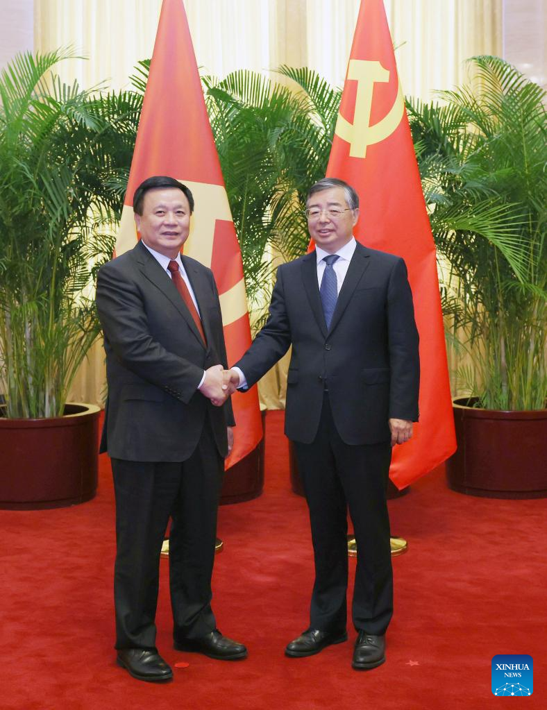 Li Shulei, a member of the Political Bureau of the Communist Party of China (CPC) Central Committee and head of the Publicity Department of the CPC Central Committee, holds talks with Nguyen Xuan Thang, a member of the Politburo of the Communist Party of Vietnam (CPV) Central Committee, president of the Ho Chi Minh National Academy of Politics, and chairman of the Central Theoretical Council, in Beijing, capital of China, July 10, 2023. (Xinhua/Wang Ye)