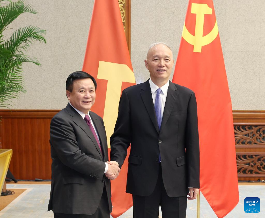 Cai Qi, a member of the Standing Committee of the Political Bureau of the Communist Party of China (CPC) Central Committee and a member of the Secretariat of the CPC Central Committee, meets with a Communist Party of Vietnam (CPV) delegation headed by Nguyen Xuan Thang, a member of the Politburo of the CPV Central Committee, president of the Ho Chi Minh National Academy of Politics, and chairman of the Central Theoretical Council, in Beijing, capital of China, July 10, 2023. (Xinhua/Wang Ye)