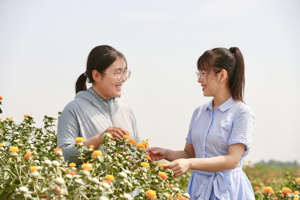 Yu Yaping (right), head of a safflower planting base in Dongguang county, Cangzhou city, north China's Hebei Province, talks about the prospects of safflower planting in a safflower field. (Photo/Chen Yinghua)