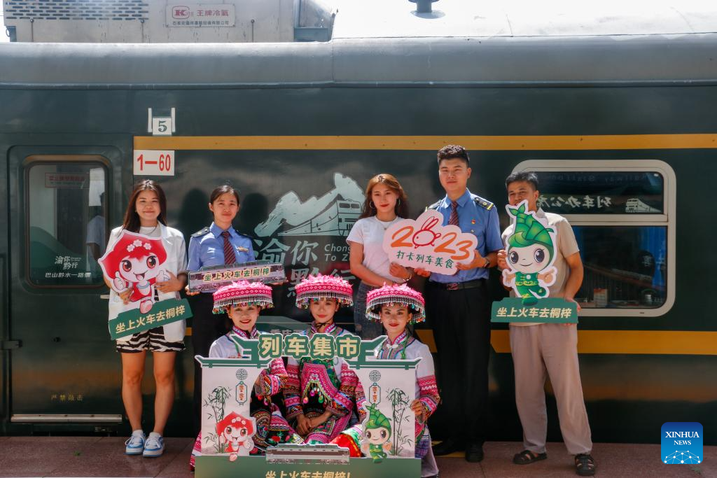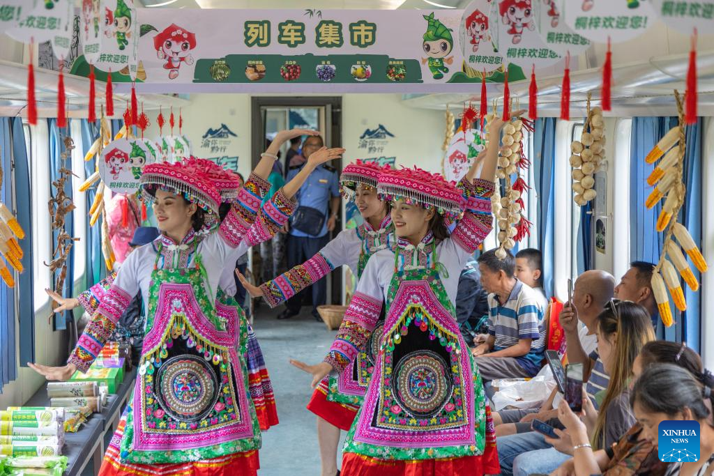 Staff members dance on train No. 5630 from Zunyi, southwest China's Guizhou Province to southwest China's Chongqing Municipality, July 11, 2023. Trains No.5630 and 5629 are "slow trains" operating between Zunyi of Guizhou Province and Chongqing Municipality in southwest China. Local railway authorities have been organizing onboard markets and performances, which allow villagers living along the trains' route to sell goods to passengers and meanwhile provide passengers with a special travel experience. (Xinhua/Huang Wei)