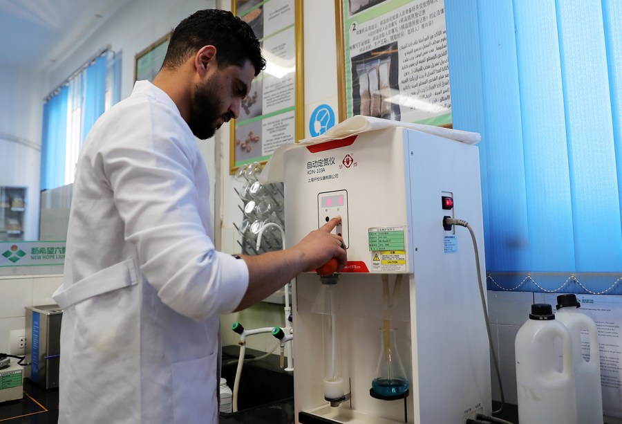 A chemist works at the lab of Chinese company New Hope Egypt Co., Ltd. in Menoufia province, Egypt, July 6, 2023. (Xinhua/Wang Dongzhen)