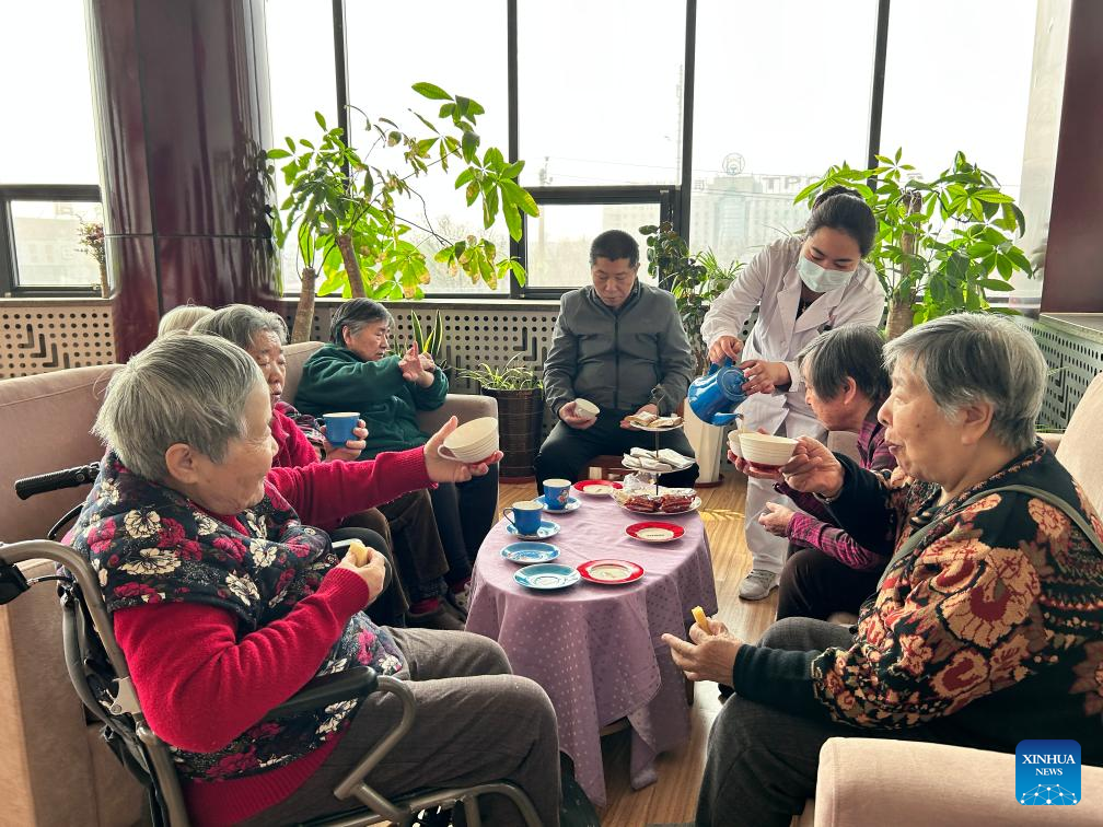 Senior citizens with cognitive disorder enjoy coffee at Hetong Cognitive Rehabilitation Center in north China's Tianjin April 17, 2023. (Xinhua)
