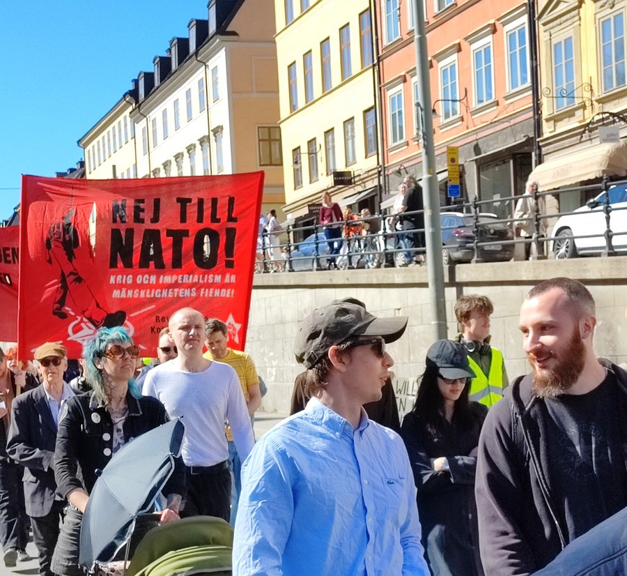 People take part in a protest against Sweden hosting a large international military exercise and the country striving to become a member of the North Atlantic Treaty Organization (NATO) in Stockholm, Sweden, on April 22, 2023. (Photo by Patrick Ekstrand/Xinhua)