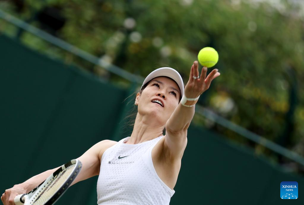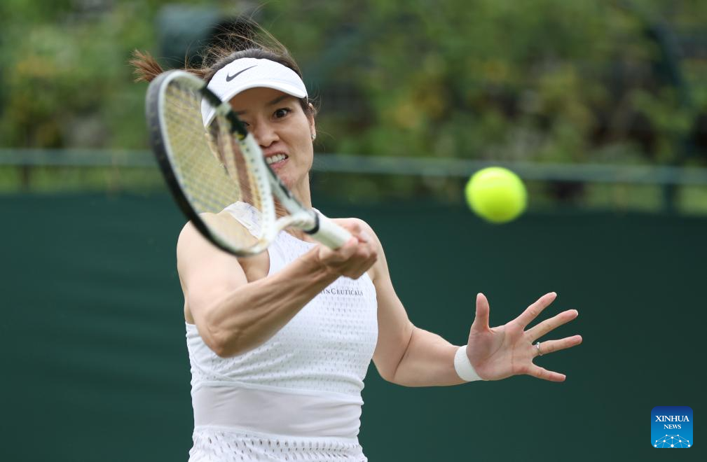 China's Li Na competes during the ladies' invitation doubles match between Vania King of the United States/Yaroslava Shvedova of Kazakhstan and Li Na of China/Agnieszka Radwanska of Poland at Wimbledon Tennis Championships in London, Britain, July 11, 2023. (Xinhua/Li Ying)