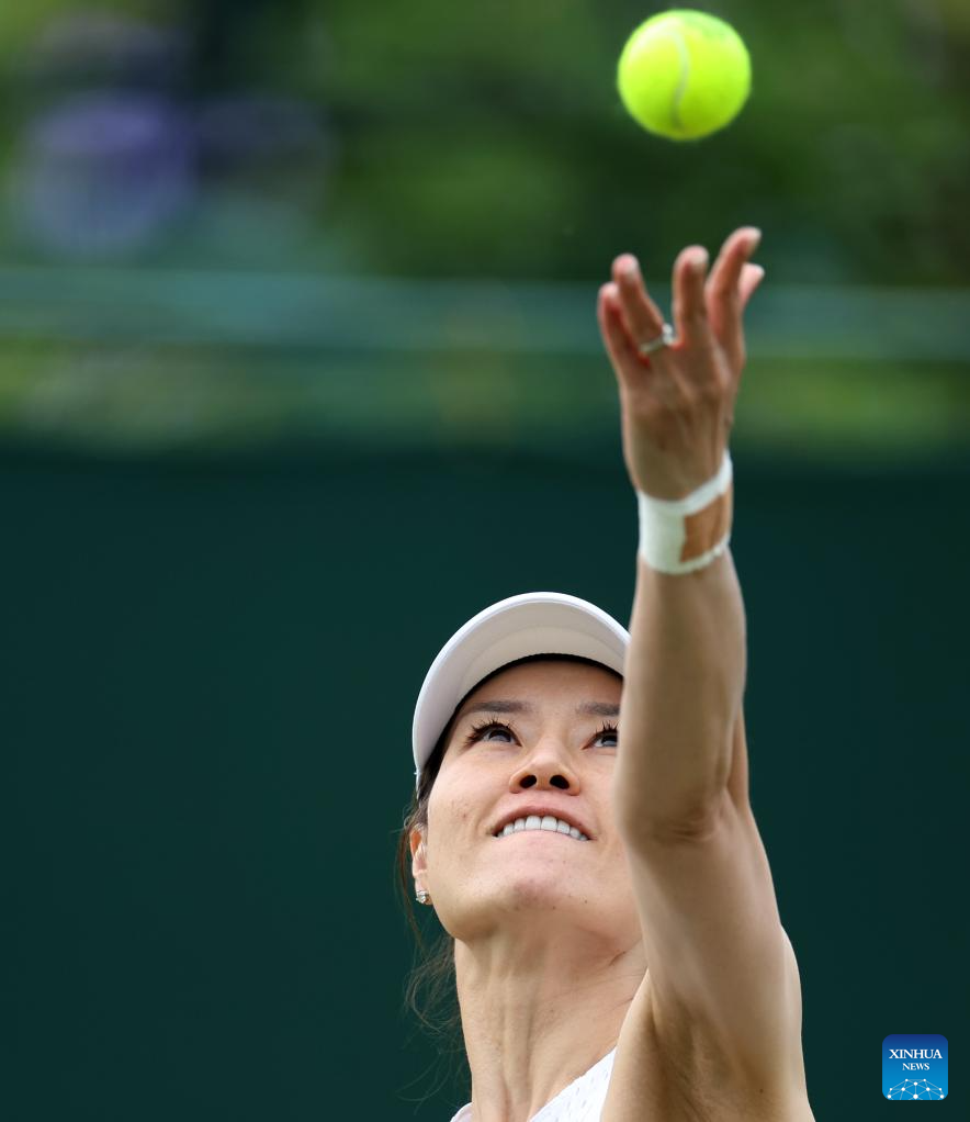 China's Li Na serves during the ladies' invitation doubles match between Vania King of the United States/Yaroslava Shvedova of Kazakhstan and Li Na of China/Agnieszka Radwanska of Poland at Wimbledon Tennis Championships in London, Britain, July 11, 2023. (Xinhua/Li Ying)
