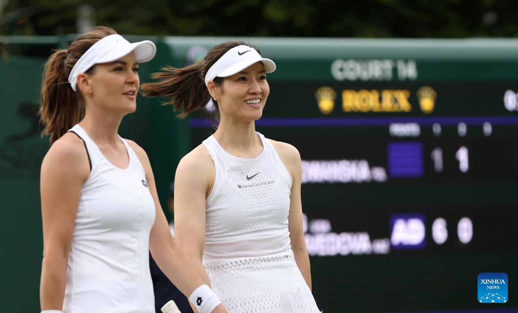 Li Na (R)/Agnieszka Radwanska react during the ladies' invitation doubles match between Vania King of the United States/Yaroslava Shvedova of Kazakhstan and Li Na of China/Agnieszka Radwanska of Poland at Wimbledon Tennis Championships in London, Britain, July 11, 2023. (Xinhua/Li Ying)