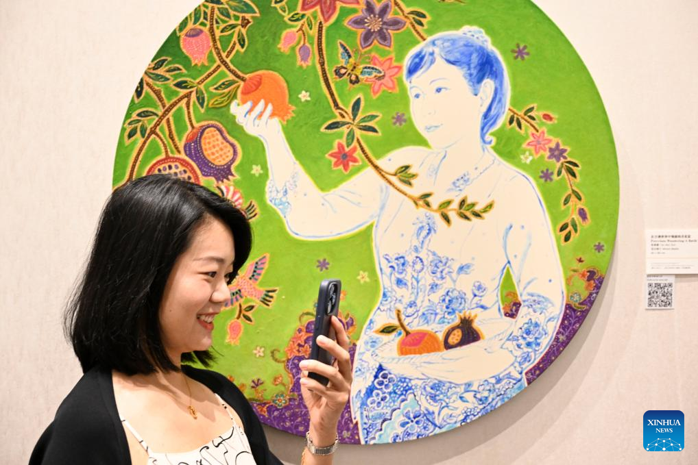 A visitor takes photos with her mobile phone at the "Integration and Diversity" Invitational Exhibition of Contemporary Malaysian Figure Paintings of Eminent Artists at the China Cultural Center in Kuala Lumpur, Malaysia, on July 11, 2023. (Xinhua/Cheng Yiheng)