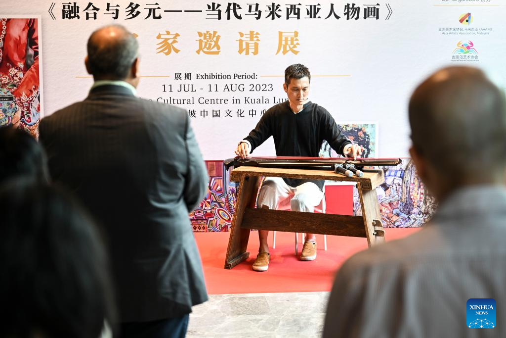 A musician plays the Chinese guqin during the opening ceremony of the "Integration and Diversity" Invitational Exhibition of Contemporary Malaysian Figure Paintings of Eminent Artists at the China Cultural Center in Kuala Lumpur, Malaysia, on July 11, 2023. (Xinhua/Cheng Yiheng)