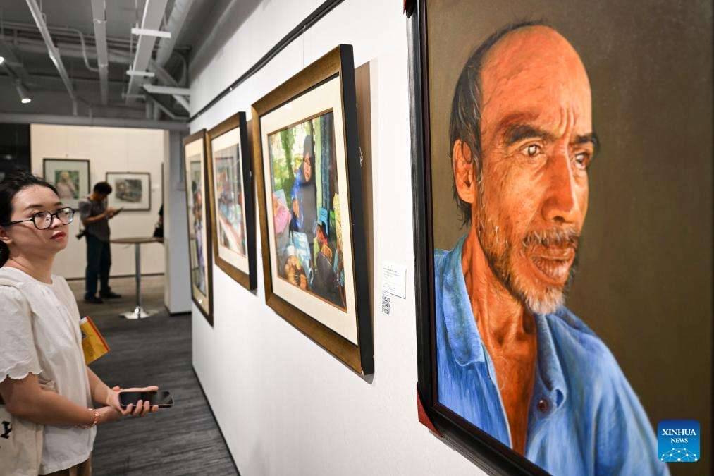 A visitor looks at works on display at the "Integration and Diversity" Invitational Exhibition of Contemporary Malaysian Figure Paintings of Eminent Artists at the China Cultural Center in Kuala Lumpur, Malaysia, on July 11, 2023. (Xinhua/Cheng Yiheng)