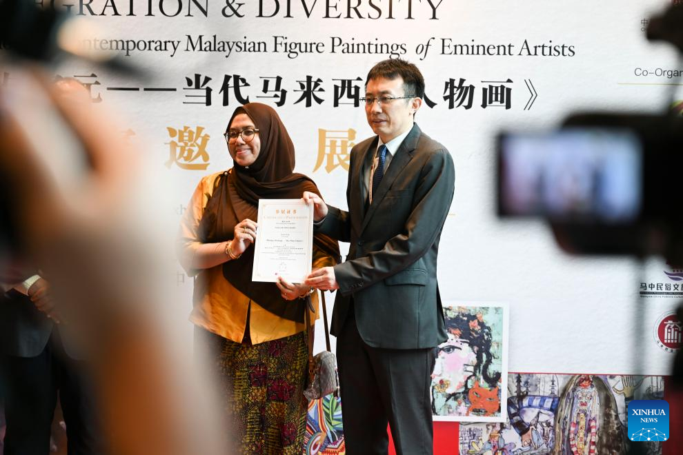 Zhang Jiexin (R), director of the China Cultural Center in Kuala Lumpur, presents a certificate to an artist at the "Integration and Diversity" Invitational Exhibition of Contemporary Malaysian Figure Paintings of Eminent Artists at the center in Kuala Lumpur, Malaysia, on July 11, 2023. (Xinhua/Cheng Yiheng)