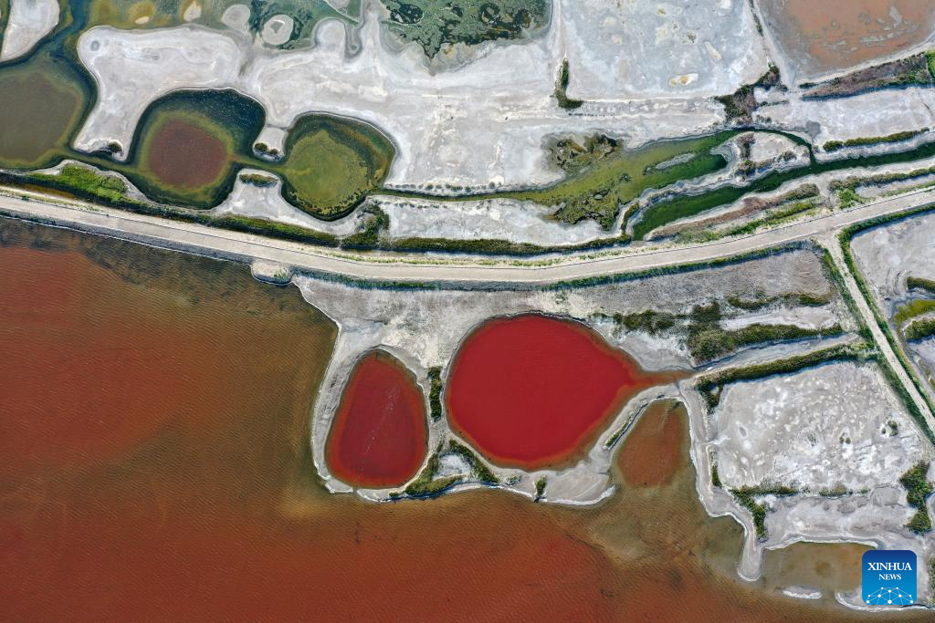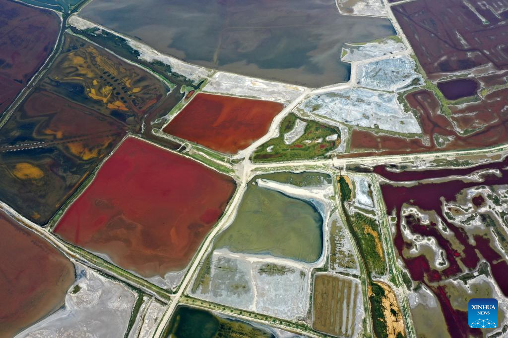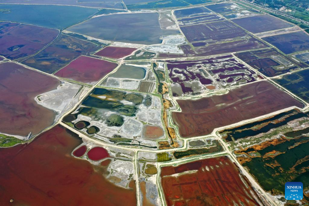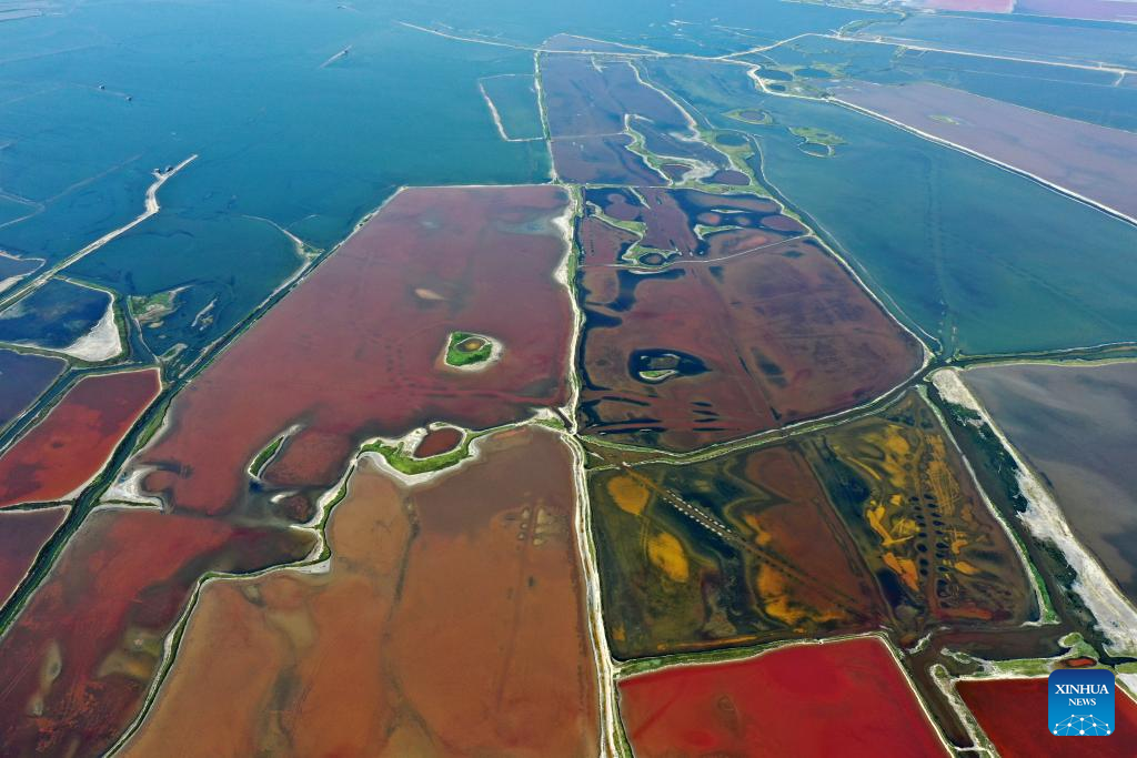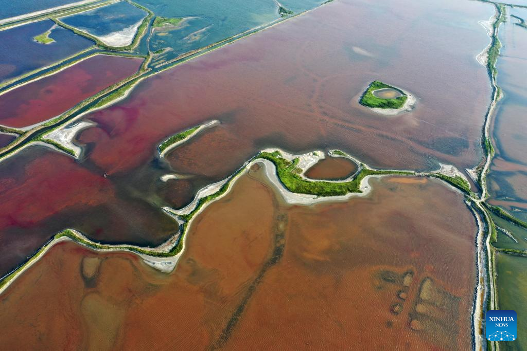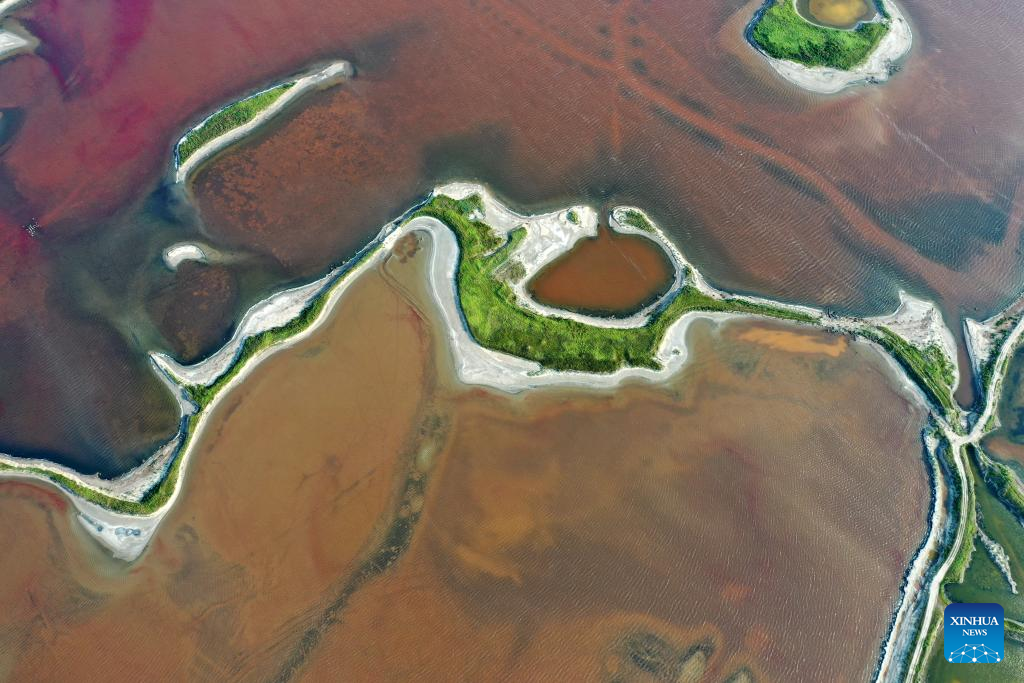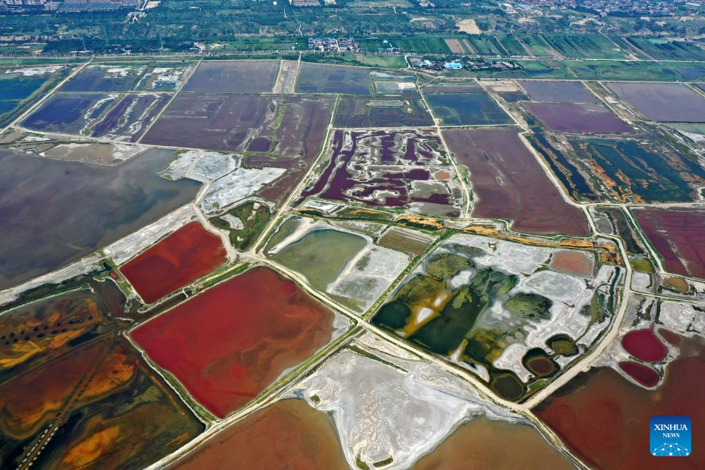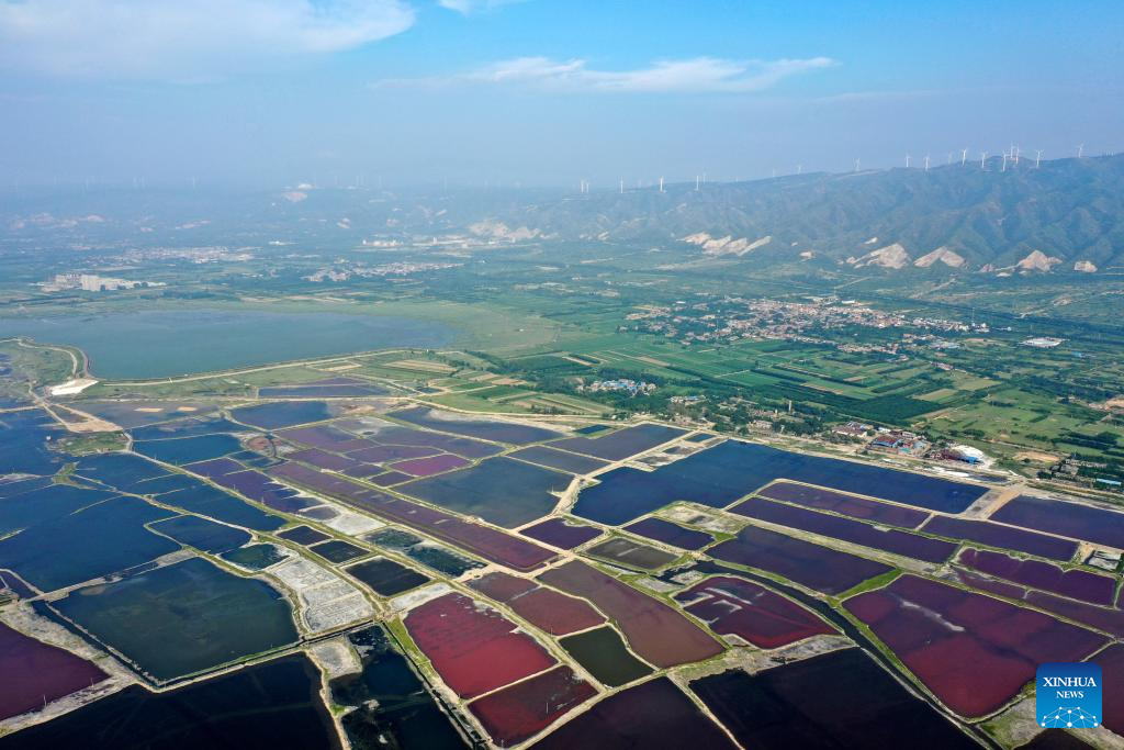 This aerial photo taken on July 11, 2023 shows the Salt Lake in Yuncheng City, north China's Shanxi Province. Yuncheng Salt Lake has a history of over 4,600 years of exploitation, with profound cultural heritage and significant historical value. In recent years, local authority has insisted on giving priority to protection and green development and stopped all industrial production within the protection area of the lake, in a bid to promote industrial transformation and upgrading according to local conditions. (Xinhua/Zhan Yan)