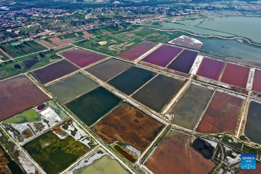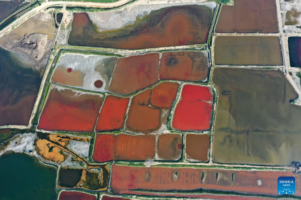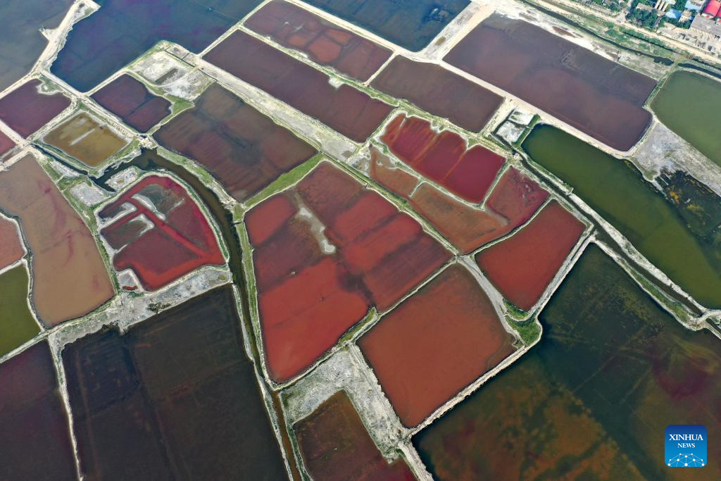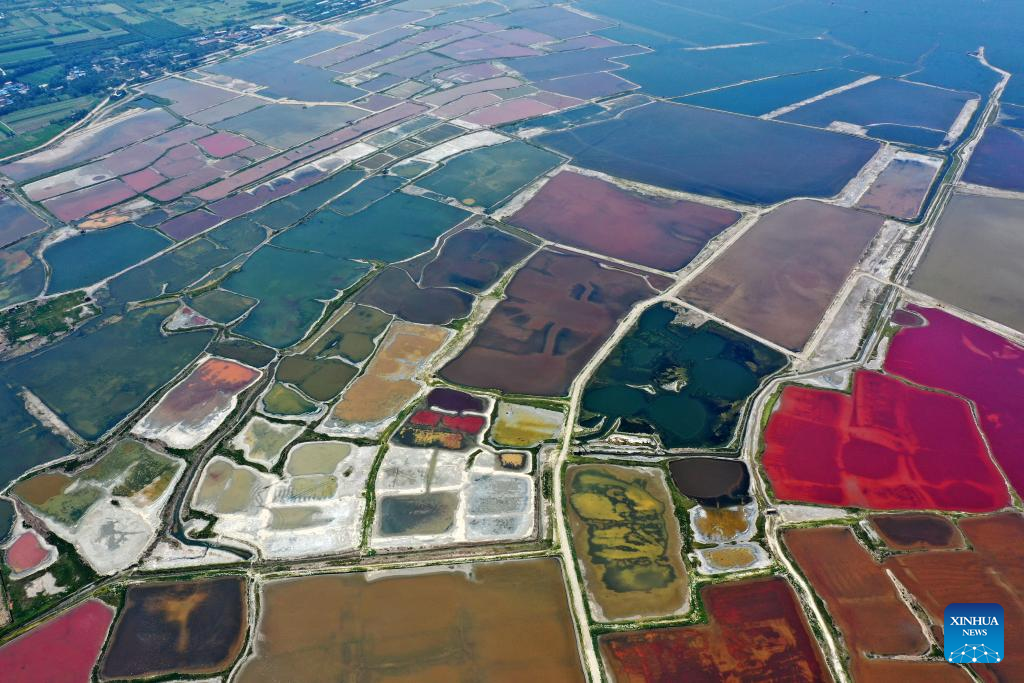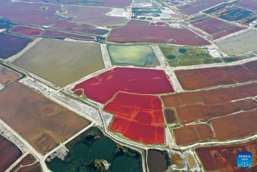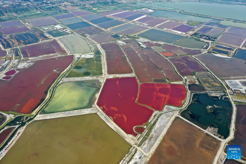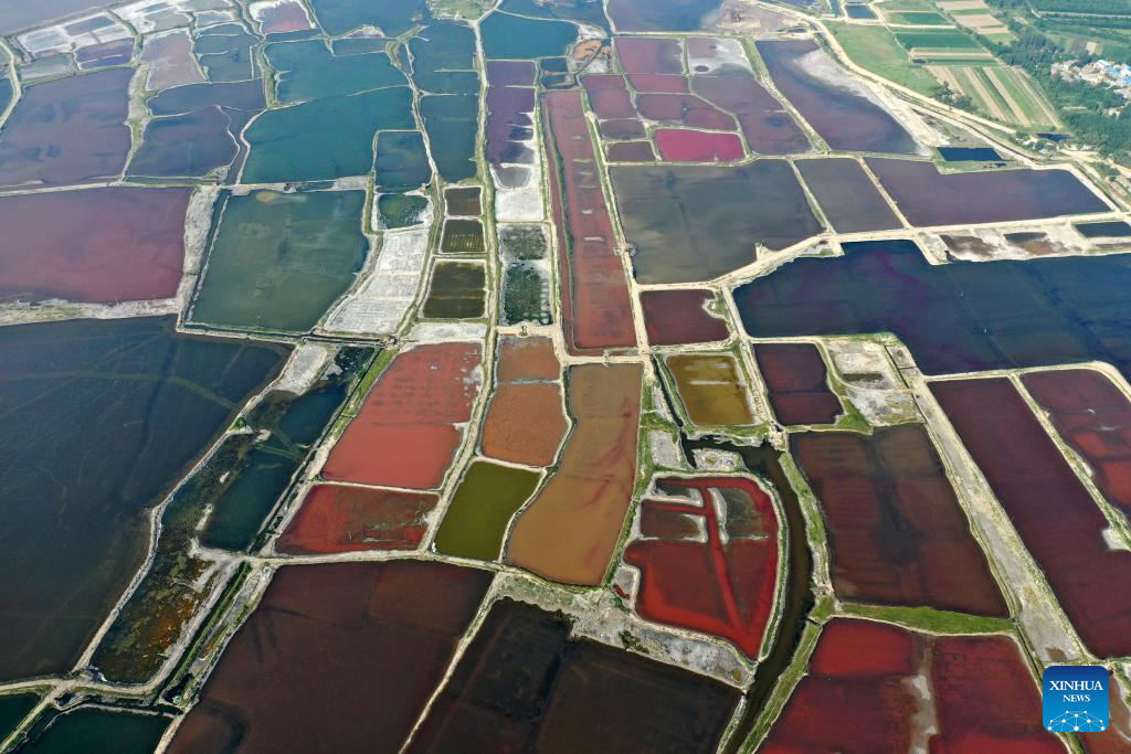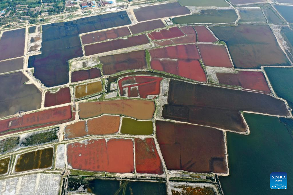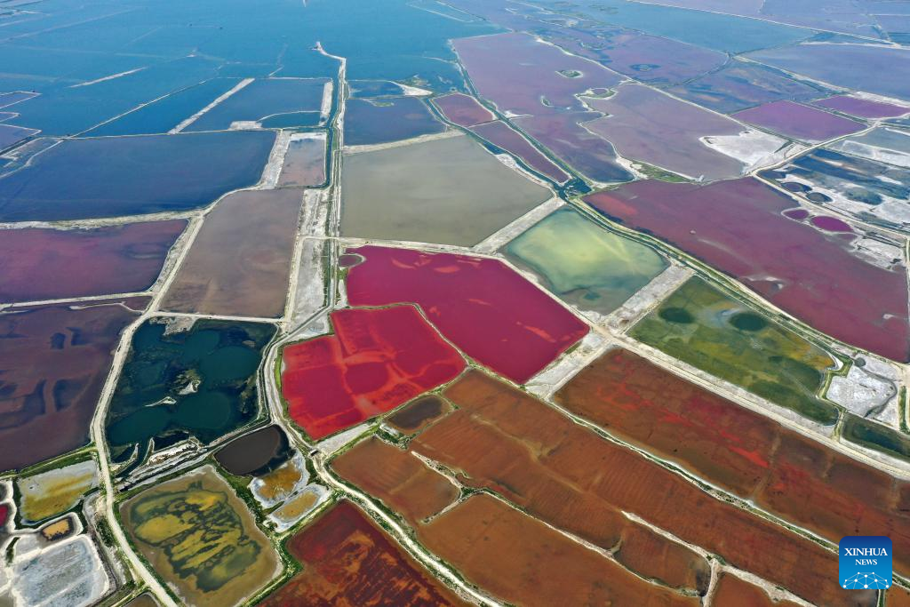 This aerial photo taken on July 11, 2023 shows the Salt Lake in Yuncheng City, north China's Shanxi Province. Yuncheng Salt Lake has a history of over 4,600 years of exploitation, with profound cultural heritage and significant historical value. In recent years, local authority has insisted on giving priority to protection and green development and stopped all industrial production within the protection area of the lake, in a bid to promote industrial transformation and upgrading according to local conditions. (Xinhua/Zhan Yan)