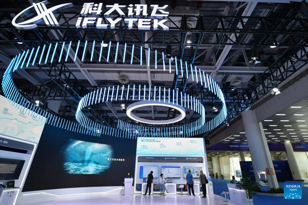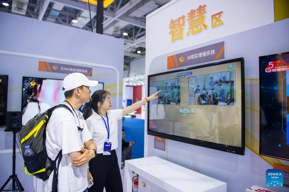 This photo taken on July 12, 2023 shows the China New Media Technology Exhibition at the 2023 China New Media Conference in Changsha, central China's Hunan Province. More than 800 people, including representatives of central and local government departments, news organizations, online platforms and universities and institutions, attended the conference. (Xinhua/Chen Zeguo)
